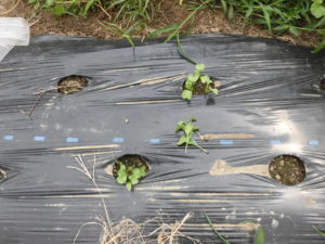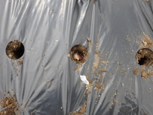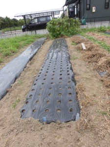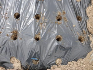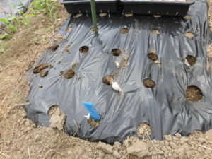 1、マルチの穴へ棒を刺して、種を植える穴を作ります