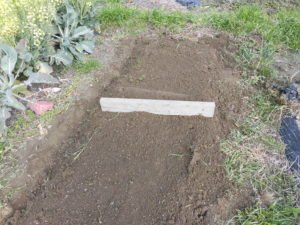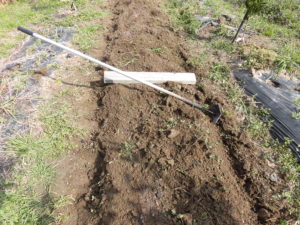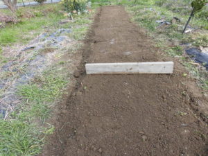 畝はトンボでならして最後は板で幅を合わせて平らにします。