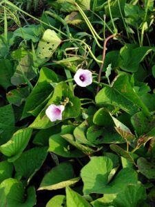 サツマイモは普段、観賞用の花を目的に育てる植物ではないので、畑で花を見ることはかなり珍しいです。